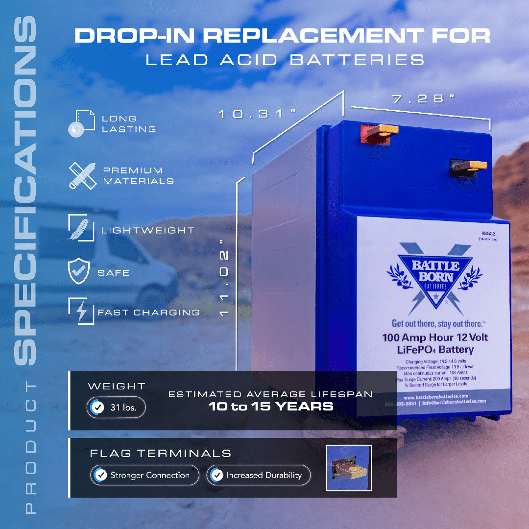 This Battle Born Batteries heated battery kit offers you a 100Ah GC2 Heated Battle Born Battery, 1 Heat Battery Kit, and 1 Heat Battery Jumper Wire.