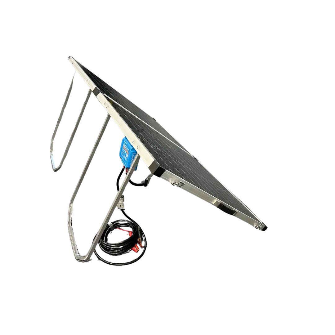 Quick to set up and easy to carry, this 220W portable solar panel kit is ideal for RVs, boats, vans, and camping. Includes solar modules, stand, protective bag, cables, and a Victron SmartSolar MPPT 75/15 controller with Bluetooth monitoring.